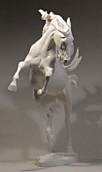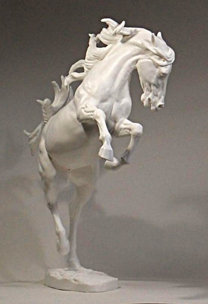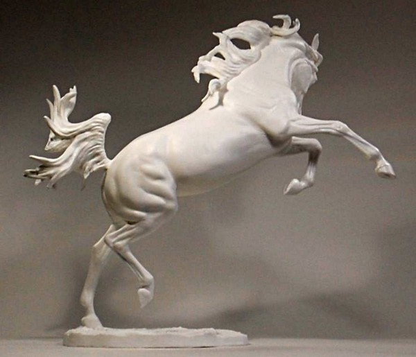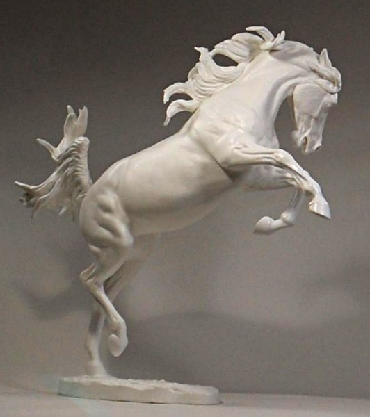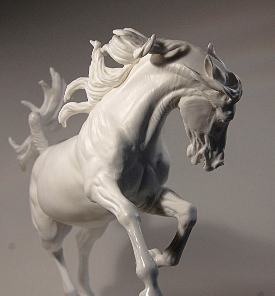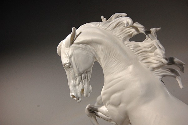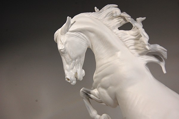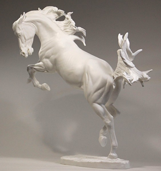 Superlumina is cast in white resin by Mountain View Studios. She has steel reinforced legs and tail, with an extra heavy rod running through her left hind leg into her permanently atached base. She is detailed from the veins on her ears to the delicate wrinkles on her flexed pastern--details that barely show up in photos! Even the inside of her mouth is fully detailed, with teeth and tongue.